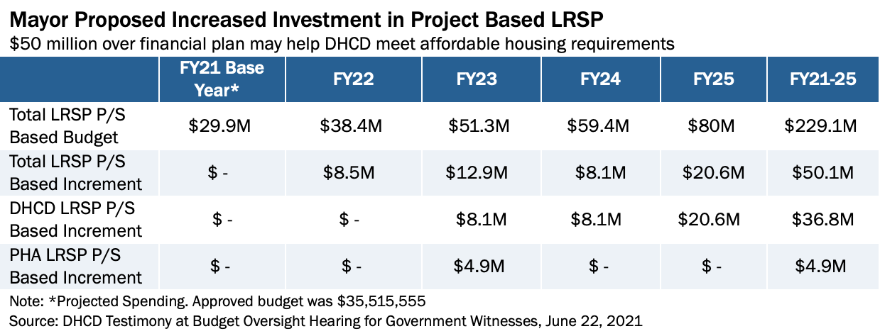 In addition, the Mayor proposes increasing the efficiency and transparency of tenant and project-based LRSP funding and administration in the Budget Support Act, such as giving DHCD and the Department of Human Services more power to control LRSP spending. However, several questions remain about this new process, including a new category of capital-based assistance for housing production and rehabilitation run by developers and nonprofits. Although DHCD said that nothing will fundamentally change due to the new capital-based allowance, DCFPI encourages the Council to use the budget oversight hearing for DCHA government witnesses to seek additional clarity on proposed BSA changes.