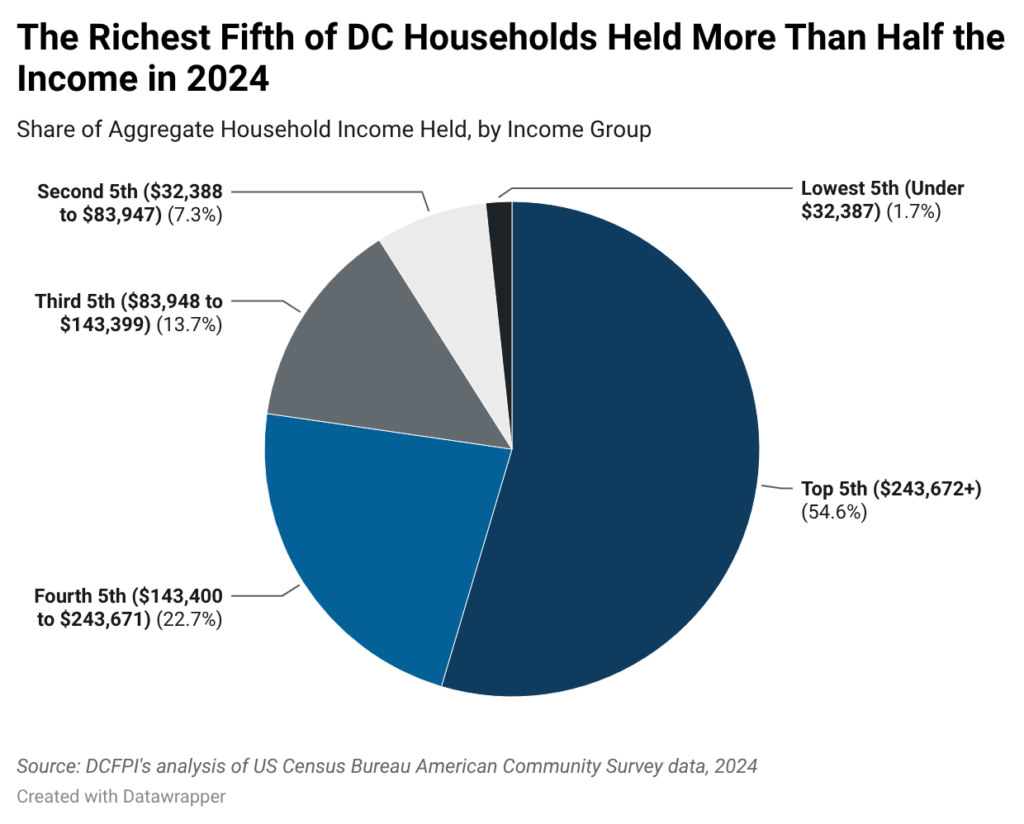 4. US Census Bureau, American Community Survey, “Shares of Aggregate Income by Quintiles” 2024. The top fifth of earners (also known as the top quintile) refers to people who have incomes in the top 20 percent of incomes in DC, i.e., higher than 80 percent of earners. The lowest fifth of earners (also known as the bottom quintile) refers to people who have incomes in the bottom 20 percent of earners in DC, i.e., lower than 80 percent of earners.