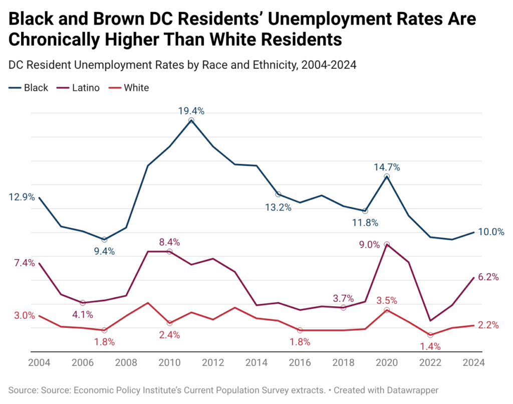Much of the economic inequality in DC is driven by racial and ethnic disparities stemming from the long history of racism in policies and systems that denied Black, and later non-Black people of color, in DC equal access to quality education, jobs, and wealth-building opportunities. Black and Latino residents have worse economic outcomes than white residents by every economic measure, both during good and bad economic times. For example, the median hourly wage for white DC workers in 2024 was about 1.8 times higher than that of Black and Latino workers.[6] Employment is also less secure for Black and Latino District workers than white workers. Between 2004 and 2024, average unemployment for Black workers ranged from 9.4 percent to 19.4 percent and average unemployment for Latino workers ranged from 2.6 percent to 9 percent. By comparison, white unemployment was as low as 1.4 percent and never higher than 4.1 percent (Figure 2).[7]