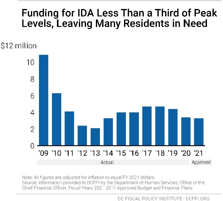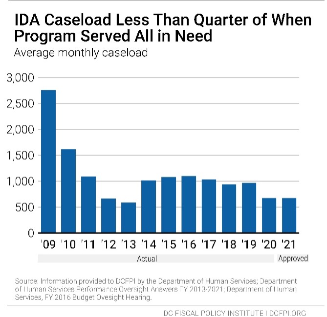 The total proposed FY 2022 budget for IDA is $3.3 million, combining $2.5 million in local funds with $800,000 in federal reimbursements. This is less than one-third of the program’s FY 2009 peak funding level of $10.9 million and $1 million less in local funds than were allocated in FY 2019 (Figure 1).