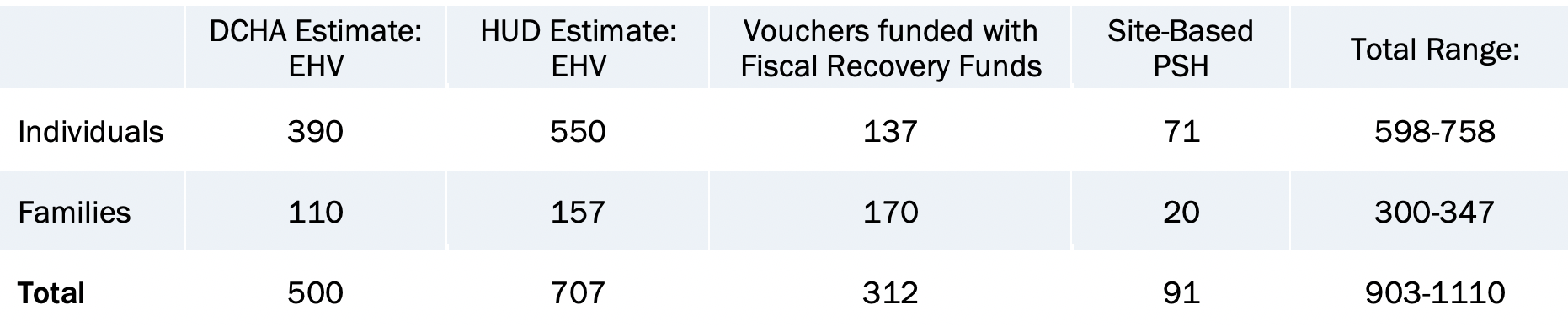 The proposed budget combines Emergency Housing Vouchers funded in the American Rescue Plan (ARP) and Fiscal Recovery Funds to provide Permanent Supportive Housing (PSH). The District will receive $11.7 million in voucher funding. While the U.S. Department of Housing and Urban Development (HUD) estimates this will translate into 707 vouchers, the DC Housing Authority (DCHA) estimates that it will create just 500 vouchers because of DC’s high rents. DCHA has asked HUD for additional funding to increase the number of vouchers. The following chart outlines the potential scenarios.